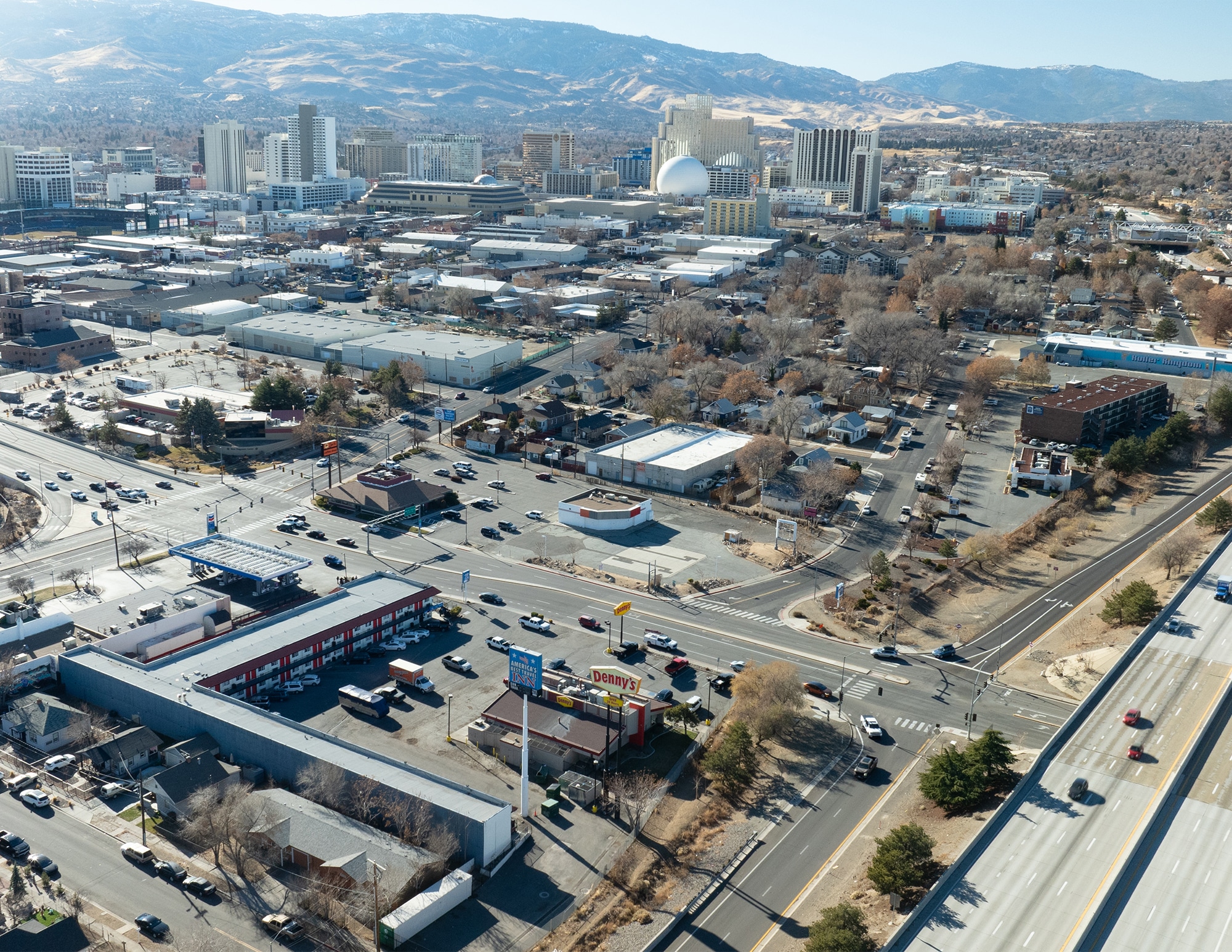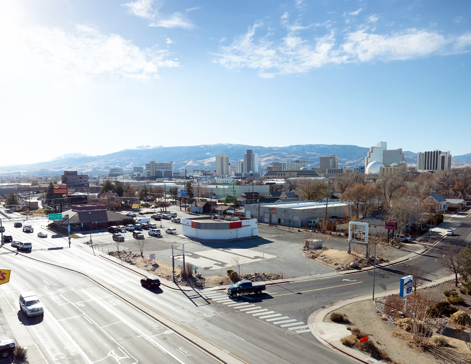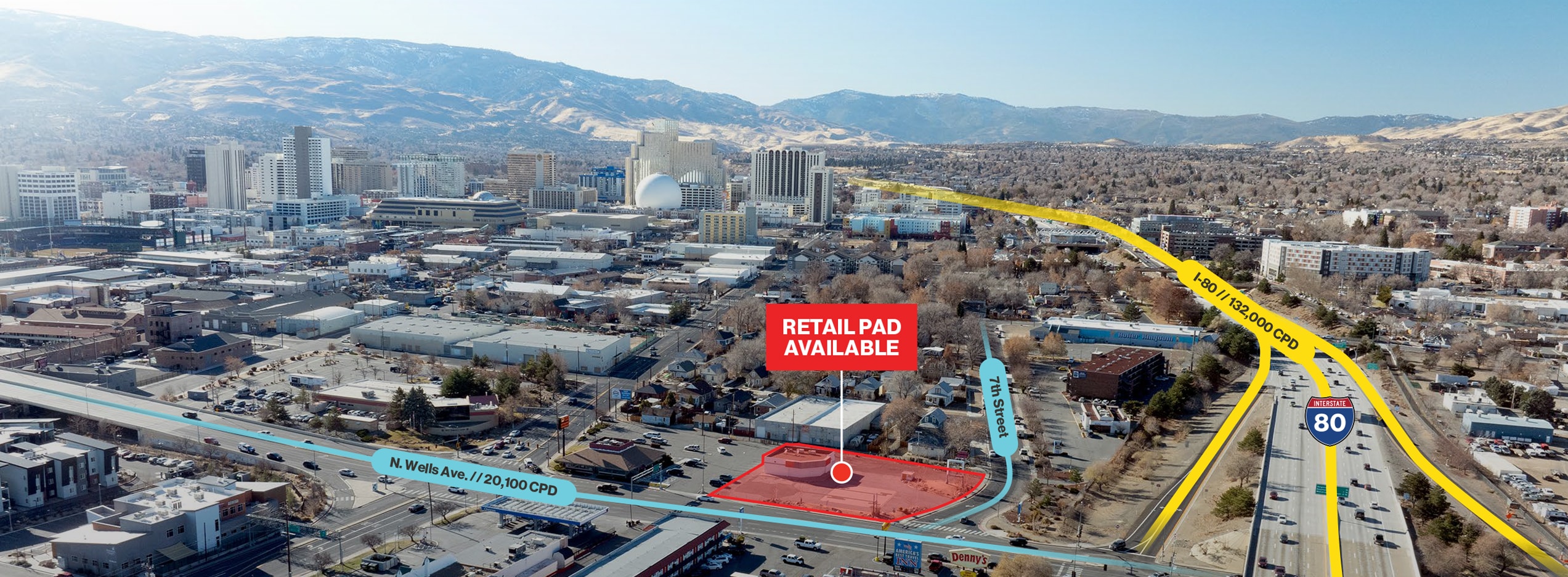 The property is situated on approximately ±8.46 acres of commercially zoned development land and is well positioned for quick-service retail or ground-up vertical development. It supports a wide range of retail and restaurant uses; however, convenience store, grocery, fuel sales, and alcohol, tobacco, or vape sales are excluded by recorded deed restrictions. The site features three pylon signs and offers excellent visibility from Interstate 80 with convenient access via the Wells Avenue on/off ramps. The property is zoned MD-ID (Mixed-Use Downtown Innovation District) under the City of Reno.