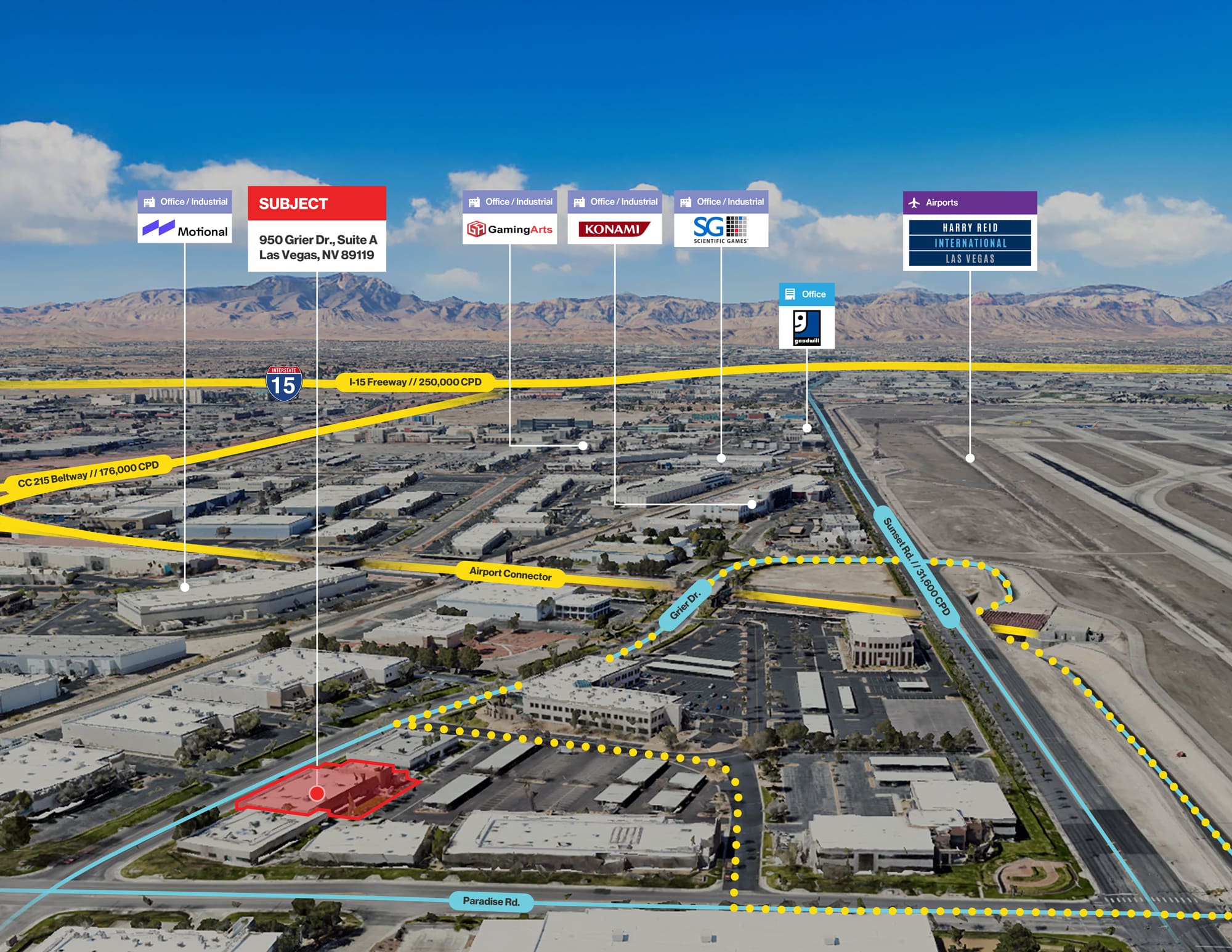 950 Grier Dr, Suite A is a single-story flex office and warehouse condo totaling ±13,875 square feet situated within the Hughes Airport Center master-planned business park, adjacent to Harry Reid International Airport. Ownership is currently in the process of subdividing the building into two condo parcels, with this offering representing the vacant west portion of the Property. The space includes a ± 1,585 square feet (± 11%) of warehouse area featuring an 18′3″ clear height and one grade-level door measuring 12′3″ × 15′2″, providing excellent functionality for light industrial or distribution use. The balance of the space is improved office area suitable for a range of professional or service-oriented users. The adjacent east portion (Suite B) is fully occupied by Cirque du Soleil, who recently executed a 7-year early lease extension through March 2033. The Property offers convenient access to Interstate 15, Interstate 215, and the Las Vegas Strip, providing excellent connectivity throughout the greater Las Vegas area. Originally constructed in 1989, the building benefits from its strategic airport-adjacent location.